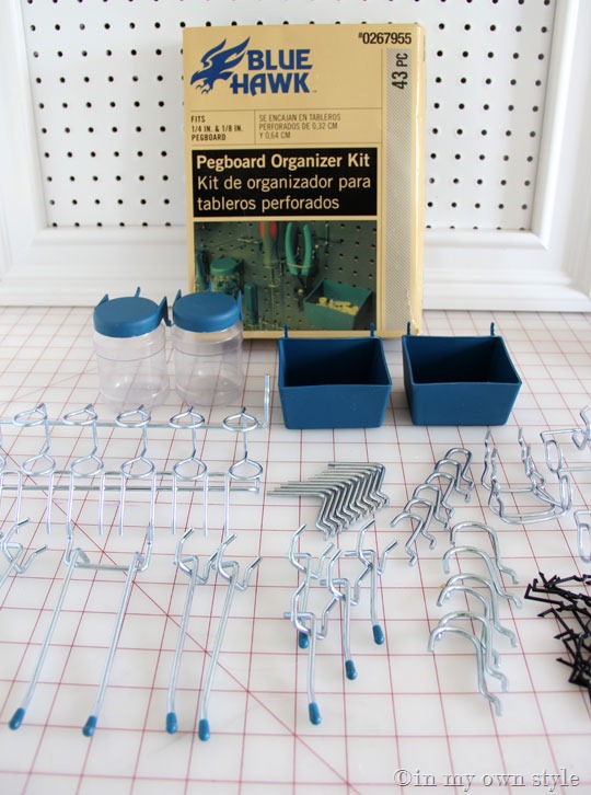 I bought this pegboard organizing kit at Lowes for $12. I didn’t use all of the hooks. The blue plastic just didn’t do it for me.