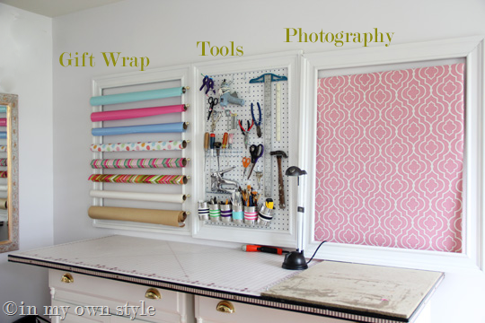 On the wall on either side of the pegboard tool organizer is a Gift Wrap Organizer and a $20 Photo Studio.