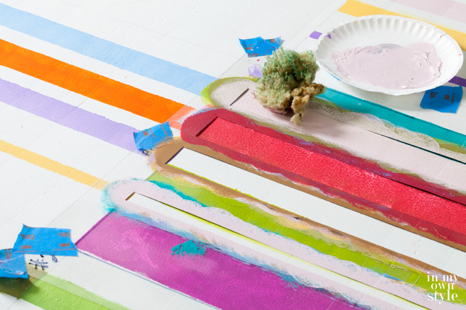 1. I tried different methods to paint the stripes and found using a small firm sea sponge or foam pouncer was better than a stencil brush or paint brush.