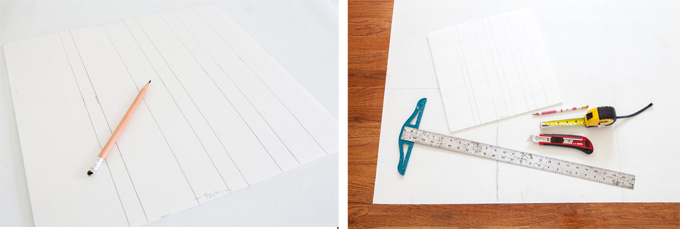 2. I randomly drew lines on the cut-out square using a ruler and pencil to create various widths of stripes. I made 9 stripes in the square. In order they approx. each measure: 1-3/4″, 1-1/2″, 3/4″, 1-5/8″, 3/4″, 1-1/4″, 2″, 3/4″, 3″