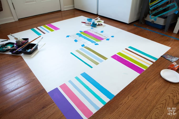 3. Paint each stripe a different color. When finished, remove stencil and the square will look like the photo on the right above. Let this dry and move to another square away from this one as you don’t want to smudge the wet paint in the square you just painted.