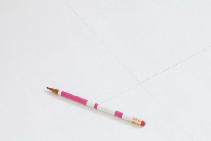 3. Use the cut-out square to create a grid pattern of squares on your primed rug area. Simply place the square in the bottom left corner and line it up with the primed edges. Use a pencil to lightly draw a line around the square. Move the square to the right, line it up and trace around it. Keep moving the square across the floor and then above the first row of squares tracing the square until you have the area covered in a grid pattern.