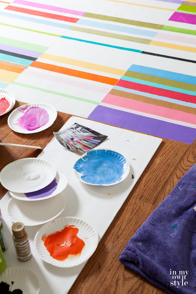 It took 2 days, about 5 hours each day to get the stripes painted on. If the stencil was still wet and I wanted to use another color to start painting another square, I had to let it dry first. This is what made the process take longer. If I had only used a few colors of paint or created more stencil sheets the painting would have gone much faster.