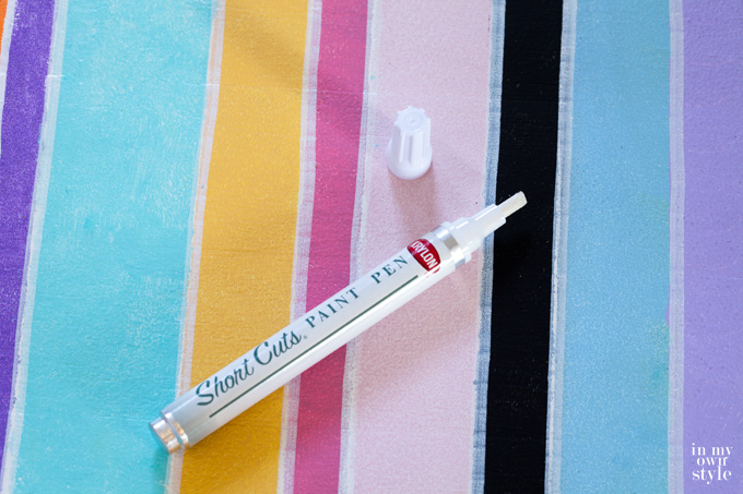 Once all the paint was dry, I used a Krylon Paint Pen in Gloss White to create a thin white stripe between each color. It hides all the imperfections in the outer lines of the colored stripes.