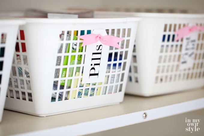 I did add white ribbon and upholstery tacks to add a bit of style in the way of shelf trim. I bought the silver upholstery tacks at Lowes. I posted about the dollar store baskets in my last post.