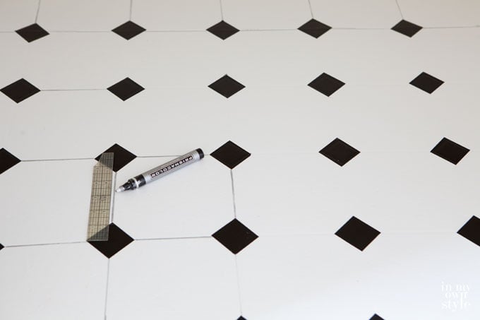 1. For the painted floor, I used the same method I did for the bathroom, but needed to create new lines to connect the black squares. I used a silver paint marker to do this. I drew over the line impressions in the flooring. If you look closely, you can see them.
