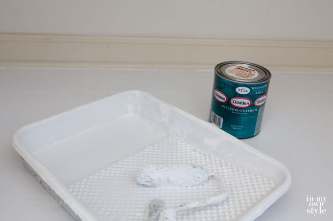 4. I used semi-gloss interior/exterior paint in white to paint the floor to match the vinyl’s sheen and color before it became discolored. Using a glossy finish is easier to wipe and clean. You can also use Floor and Porch paint in a glossy finish.
