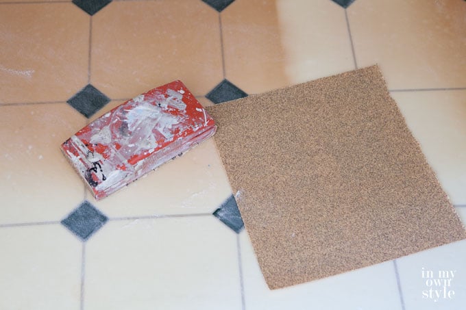 1. Sand the floor with 60-grit sandpaper to remove some of the surface shine. Sanding gives the surface some “tooth” so the paint has something to adhere to. Since the closet is small, I just used my sanding block. If you are doing an entire room, I would use a power sander. It will make the job go much faster.