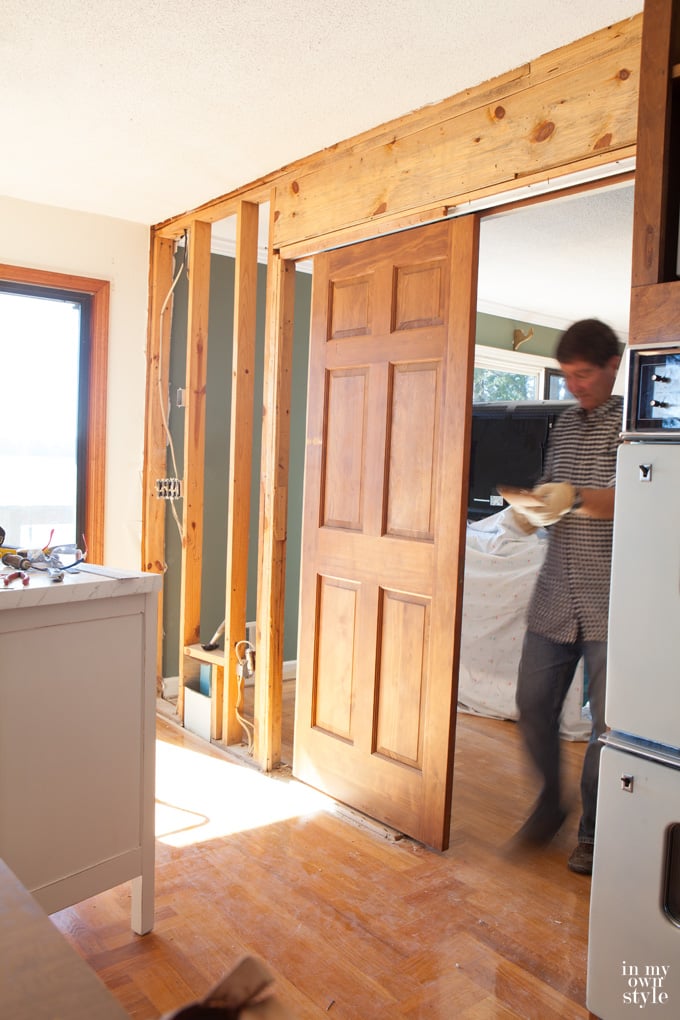 We both knew the wall and pocket door inside it needed to go. We got even more excited when the sheetrock was removed on either side of the studs. We couldn’t believe how much better the space felt, even in its raw state. More on this wall coming soon.