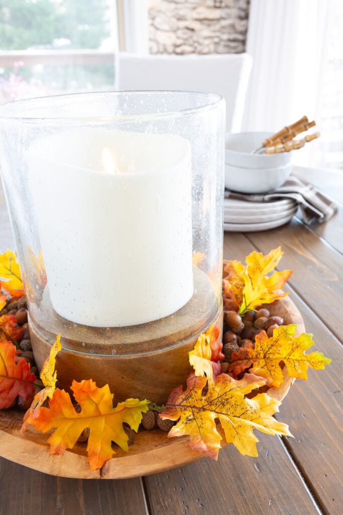 For a totally different look, remove a few of the leaves from the branches and arrange them separately around a candle placed in a bowl filled with acorns to create a fall table centerpiece.