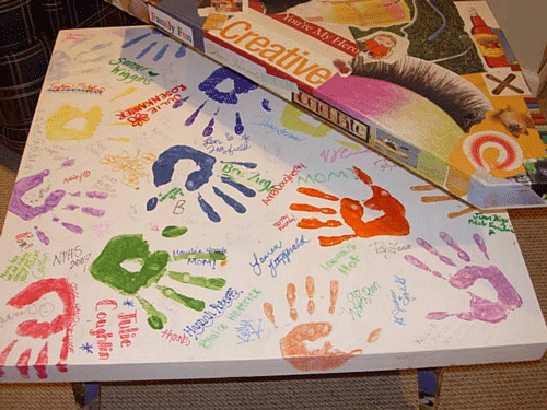 The first few friends that signed it also made a hand print with craft paint. I would suggest having a collection of permanent markers nearby for everyone to use so you won’t lose any signatures as the table ages.