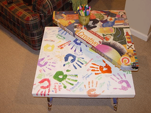 They painted the table with white latex paint. When the paint was dry they used Mod Podge to attach images they clipped from magazines to the top section of the table and the legs, leaving the main table surface for the signatures.