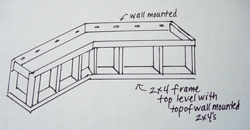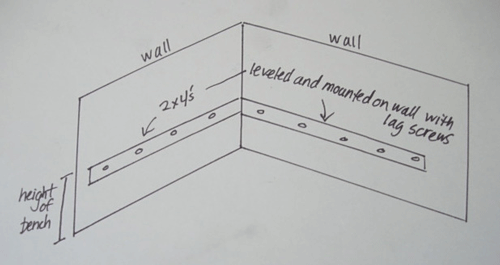Above is a simple sketch to show how I mounted the 2 x 4’s to the wall with lag bolt screws.