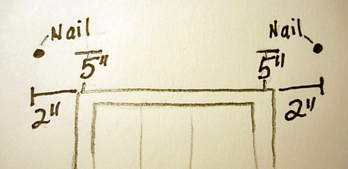 1. Measure up from outer corner of window 5″ and then over away from the window – 2″. Place nail in wall at this mark to use to hang the valance. Repeat on other side.