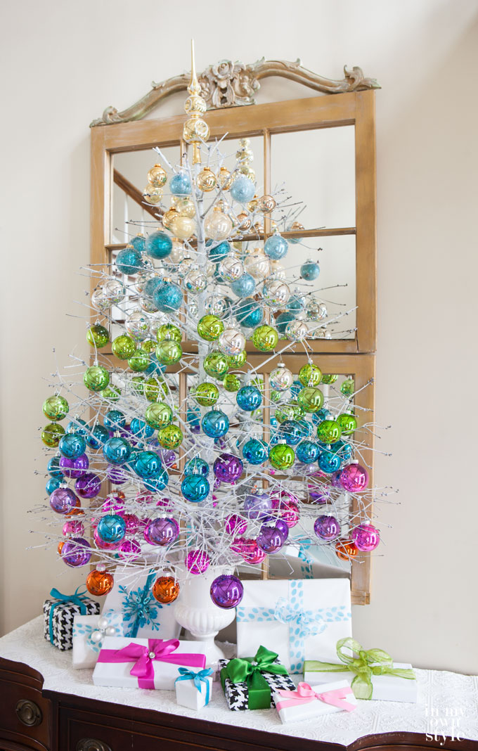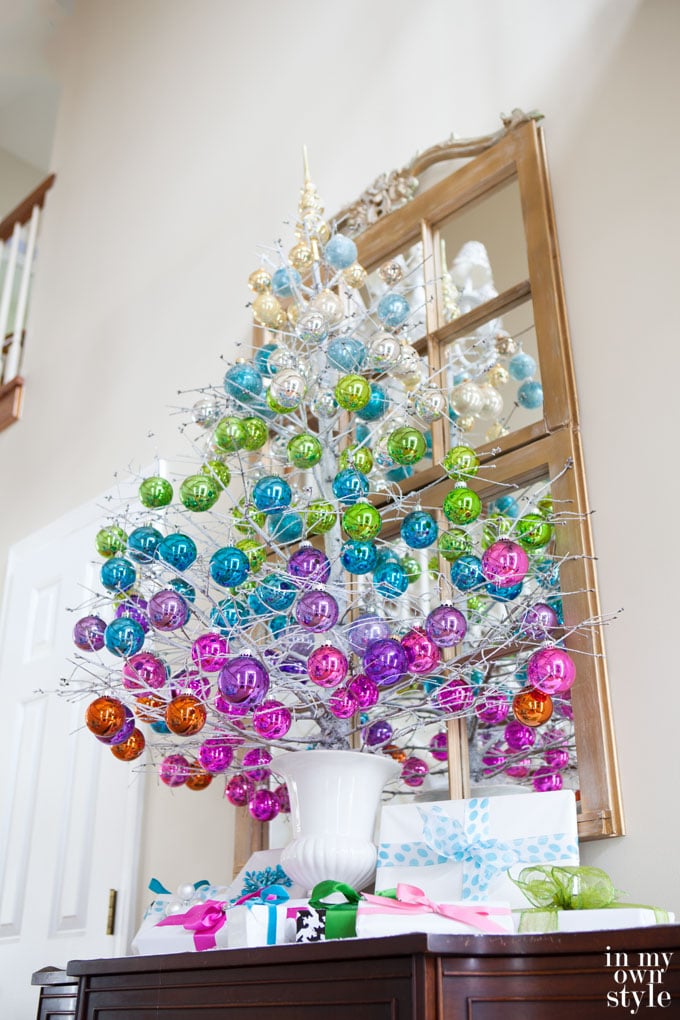 Many times I’ve walked past a dead tree or branch and thought, “Hmmm. what can be done to repurpose this lovely shape and to honor its past life?” With the gorgeously stunning white tree laden with Christmas ball ornaments in your favorite colors, you’ve shown us a marvelous way how to do just that!