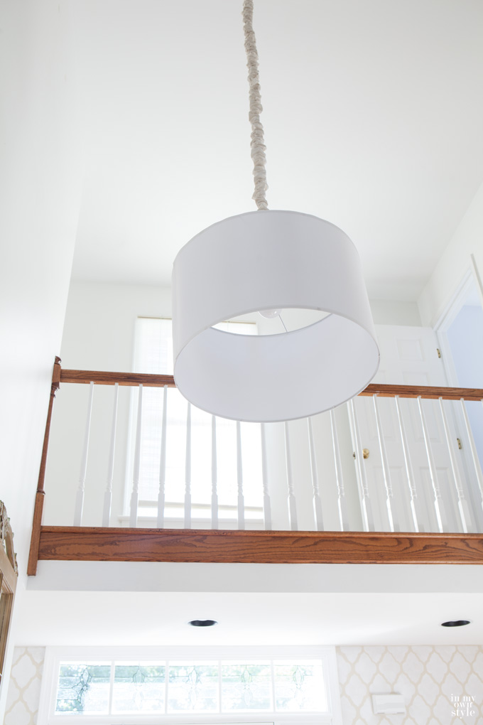 The cord is black, which I didn’t want, so I kept the previous light’s ruched cord cover I made like this one to hide it. The foyer is white, beige, and taupe so I don’t mind seeing white and off-white together.