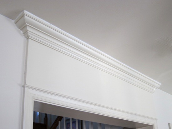 2 pieces of molding – Crown molding and a thin piece of decorative trim. The 3rd piece is the plywood board that you attach to the wall above the door opening.