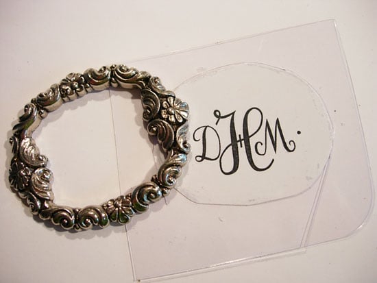 I made my monogram on my computer and sized it to fit in the inside circle of the buckle. To protect it, I covered it with clear acetate that I cut from the clam-shell packaging the Rolodex was in and glued it to the back of the buckle.