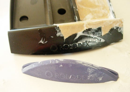 Here is what my new Rolodex looked like right out of it’s clam-shell packaging. Very business like and practical, not my style, so I took it apart. The little blue logo on the front comes off easily.