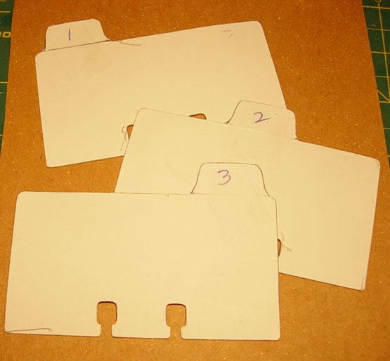 I made 1,2,3 templates – right , middle, left tabs out of one of the Rolodex cards and taped a tab I made onto each one to use as tracing templates.