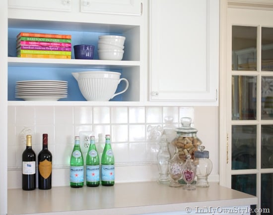 I thought about removing a few cabinet doors to create open kitchen shelving that is popular now, but I didn’t have the cabinet space to spare.