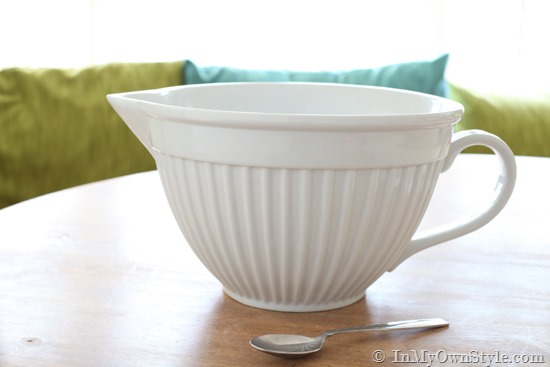 A large ceramic mixing bowl with a handle and spout. I could not pass it up when I saw it at the thrift store. It was only $3.90.