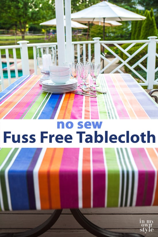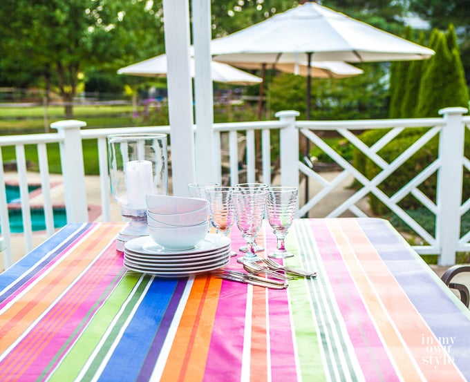 In between all the prepping and purging I have been doing the last month to ready my house to sell, I did have time to make a no sew tablecloth that is also fuss-free (in the maintenance department) for my outdoor dining table. So much of what I have been doing the past month will stay with the house. I enjoyed making something colorful that I can take with us.