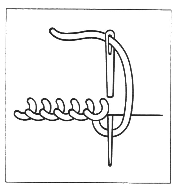 - Bring the needle out along the edge of the felt. Insert the needle above and to the right of the starting point and bring it out in line with the last stitch of fabric edge, keeping the thread behind the needle point. Continue working from left to right and top to bottom.
