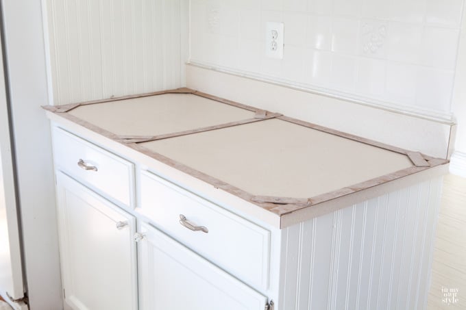 The new counters fit perfectly over the existing counters and are glued into place. I didn’t have to do anything to the existing tile backsplash.