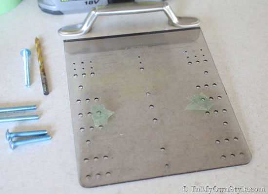 3. My pulls were 3” between the holes. I found this marking on the jig and placed tape behind the holes I needed to use. This helps you not forget which holes to use.