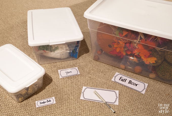 Adding labels to everything! Clear sticker style labels for storage bins as well as white labels on baskets and bags.