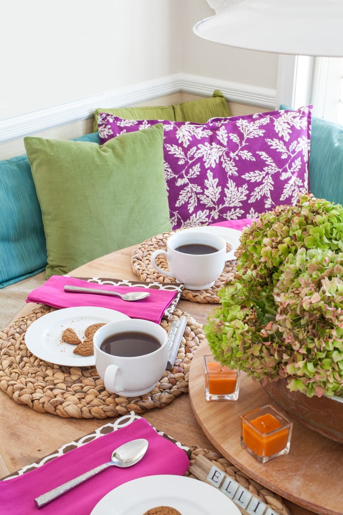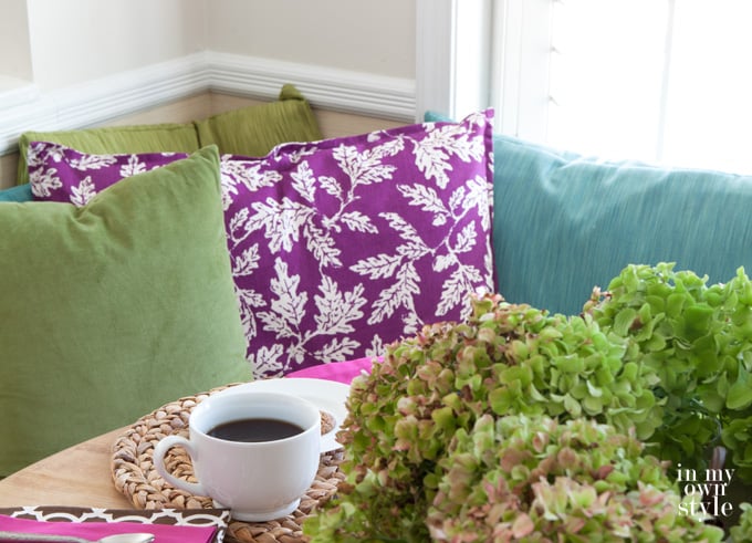 I don’t use a lot of throw pillows around my house since they usually end up taking up valuable seating and end up on the floor when someone wants to sit down. I do however like pillows on the banquette in my kitchen. It has L-shaped seating with bed size pillows along the wall that act as a backrest.