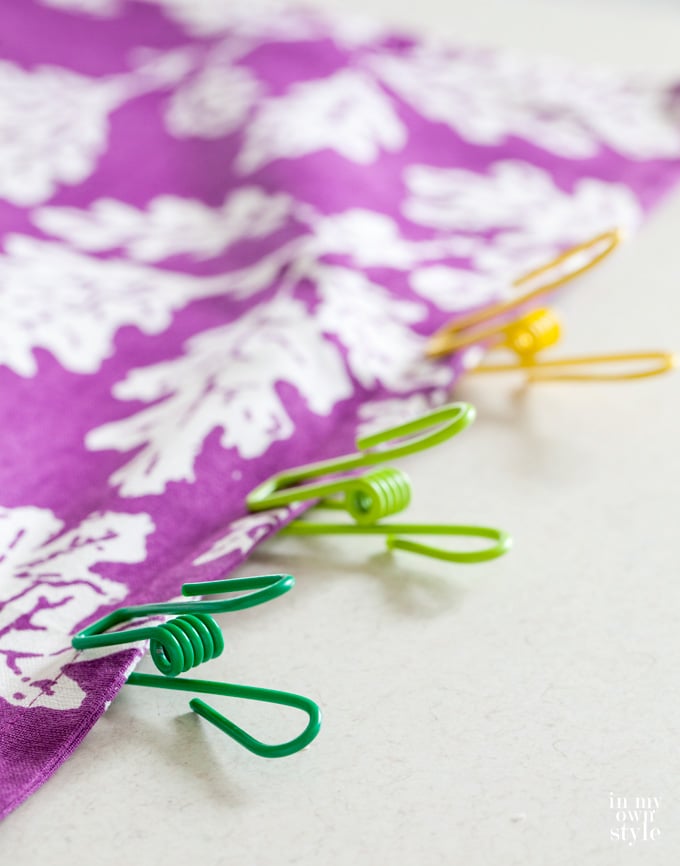 9. Remove clips and place pillow into the opening of the dishtowel cover.