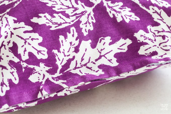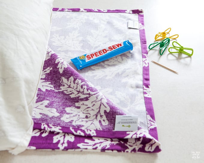 A week later, while I was strolling the aisles at Target I saw a set of purple and white oak leaf dishtowels on clearance. I loved the color and knew immediately that they were going home with me to be made into a seasonal no-sew pillow for the banquette.