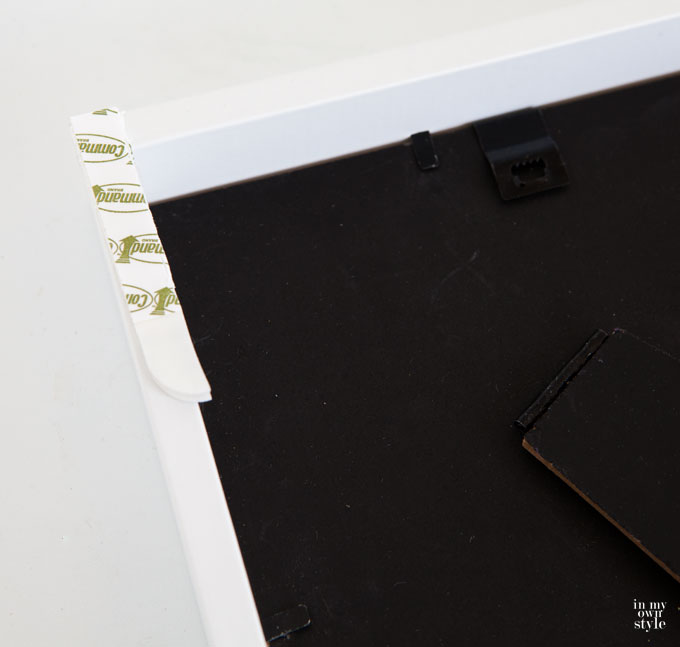3. Place a picture hanging strip on the top back corners of your frames. If your frames have narrow back corners, I have been known to cut the strips in half vertically to fit. When I do this, I add a third set of strips across the top of the frame as well as on each corner to make sure there are enough strips to hold up the weight of the frame.