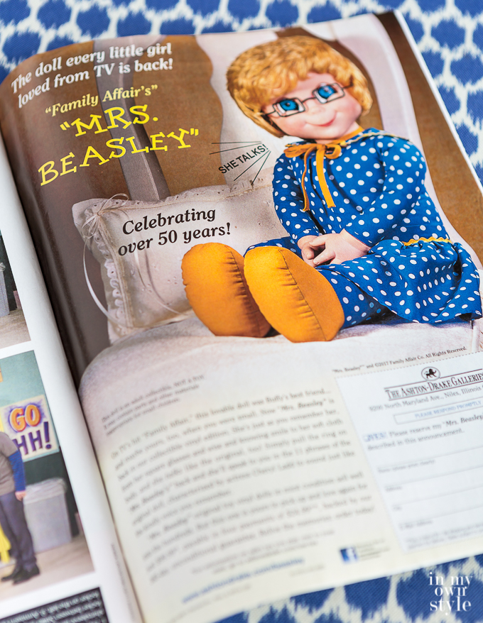 I think I had a Mrs. Beasley, but I didn’t love you as you did. I played with baby dolls. But I did love Family Affair. I sold my Family Affair lunchbox on eBay a few years ago for about $30. I had s a rush on Uncle Bill!