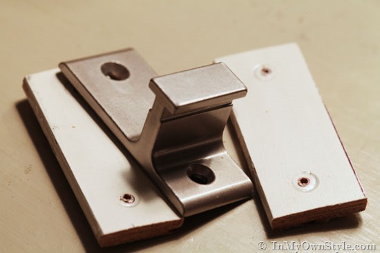 You know me, I was not going to let this stop me from having a rolling door. My solution was a 1/4-inch thick piece of plywood cut to the size of the back of the bracket. I pre-drilled holes in them to match the holes on the brackets.