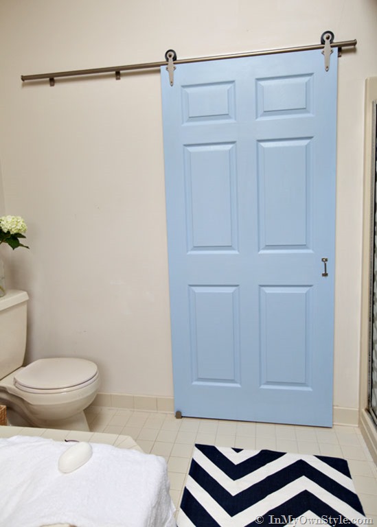 A before & after makeover showing you how I used a hardware kit to install a rolling door in my bathroom.