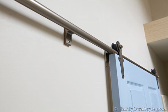 View of doorway with the rolling door hardware installed from the bedroom. I painted the outside of the door white and the inside – blue.