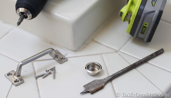 To attach the flush mounted cap pull, I needed a drill bit that would cut out a circle into the door so I could push the round metal pull into it.