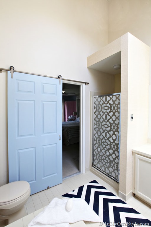 …of adding character and style to my cavernous two-story bathroom. Bold and big accessories are needed to create balance in here. The addition of the rolling door is like adding a piece of large art. I chose to paint the door a fun color – the name of the color is Celestial #A1403 from Glidden.