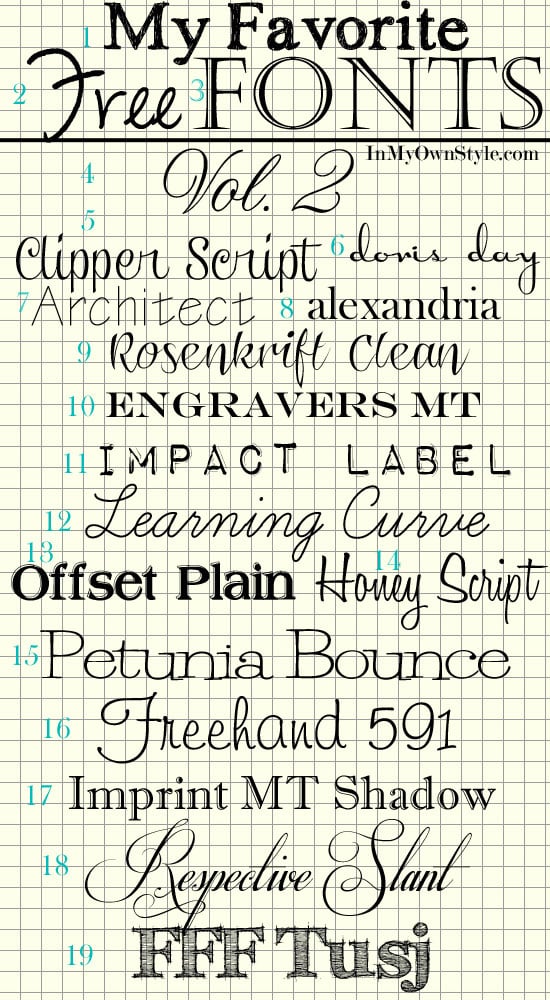 1. Hand Times 2. Susie’s Hand 3. Castellar 4. Altast Greeting 5. Clipper Script 6. Doris Day 7. Architect 8. Alexandria – is actually Baskerville Old Face 9. Rosenkrift Clean 10. Is no longer free :( Engravers MT 11. Impact Label 12. Learning Curve 13. Offset Plain 14. Honey Script 15. Petunia Bounce 16. Freehand 591 17. Imprint MT Shadow 18. Respective Slant 19. FFF Tusi