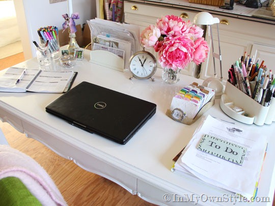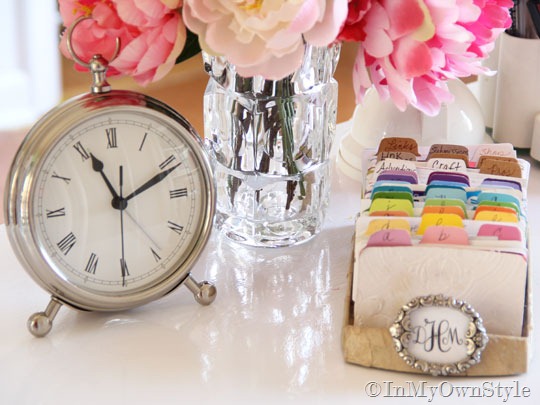 On one side I have all my pens and pencils, my second brain –my DIY Rolodex, desk clock, and flowers.