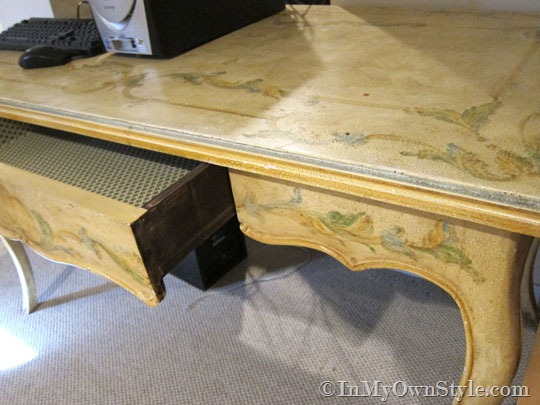 When I picked up the desk in curbside trash, it had a yellow aged and painted design. Nice, but not quite my style. The legs were pretty beaten up and white where the finish had worn in spots.