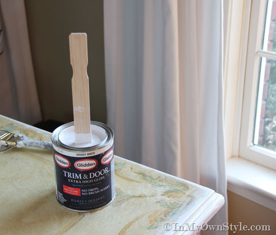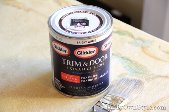 To create the durable, super extra high gloss furniture paint finish I used Glidden Oil Base Trim and Door paint that I bought at The Home Depot.