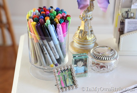 On the other end I keep all my colorful markers in a thrift store find, photos of my daughters when they were little, and a few favorite objects.