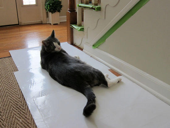 I didn’t want little cat paws in the stain, paint, and poly. He of course was curious to see what I was up to every time I worked on the steps. He thought he was my helper. He did end up one day with a bit of white paint on his tail.