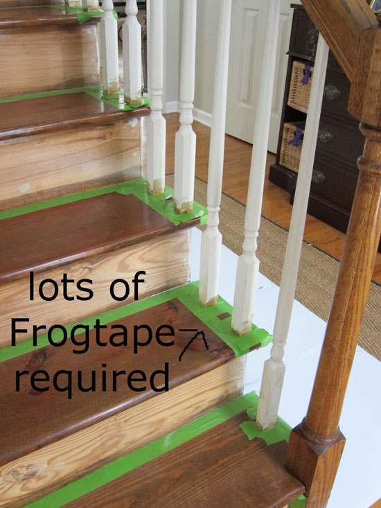 When I painted each riser and baluster I used Frogtape to mask out the areas I didn’t want the paint to touch.