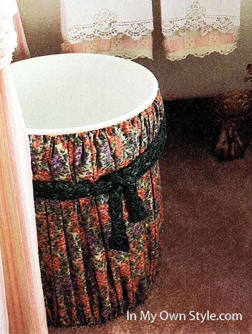 Here is a photo of the 1994 version from my book. I made it with a 5 gallon paint bucket. So if you create a lot of waste – a larger version is just as easy to make. The directions are the same as covering the smaller 2 gallon size – you will just need more fabric. Instead of using ribbon, I made cord to wrap around this one by braiding fabric strips together.
