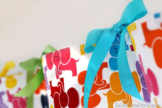 Very cute – the fabric paired with the ribbons just makes it. I’m wondering the specifics on the ribbon – how thick was it and how long did you cut it? Also, do the ties seems to lie easily to the front? It seems like if I did this the bows would be crooked. Help!!… :)